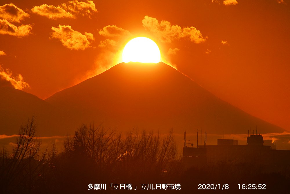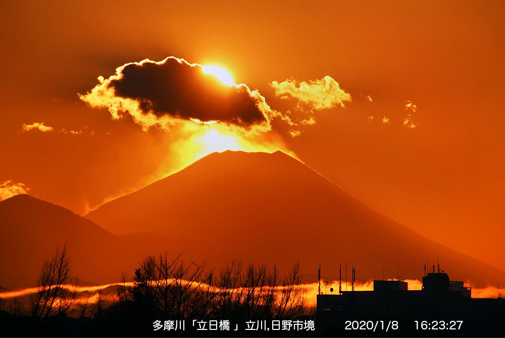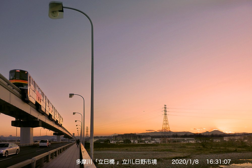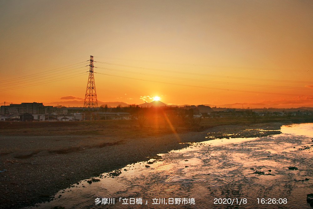 ダイヤモンド富士 多摩川「立日橋」立川,日野市境 多摩モノレール 柴崎体育館駅 ←→ 立日橋 約8,600歩 1月8日撮影 ホームページ「若松陞写真集」Photo album http://nwakamatu.planet.bindcloud.jp/index.html