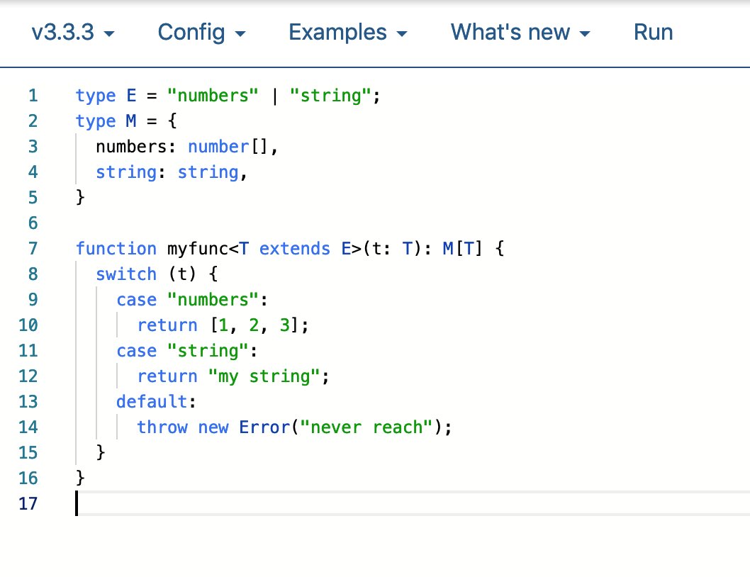 myfunc2は通る。myfunc2を冗長にしただけだと思われるmyfunc3は通らない... 3.4だと通る。最新のTSでも動くような解決策を見出したい。 https://www.typescriptlang.org/play/?ts=3.5.1#code/C4TwDgpgBAslC8UDeAoKUB2BXAtgIwgCcBnALk1wMIG0BdAbjSmOEIEsMBzcl9rgGhQBfFCgBmWDAGNgbAPYYoOEBOkAmADwBpKBAAewCBgAmxKAGsIIOWNgA+ABQ5yMfhfJaAlC+pbayJkIIYCxCRRxqcwZhUQB6WKUVSSk1QCSGQHTFQHdUwHUGQH0GQAMGQEUGQDsGQHsGQC0GQCAGcWTZBUTVKQBmbV0DI1MLKxt7Jxc3cw9vWF9-VHRiAHc2YCkACygHc08A9HQpAENiaAAibHwiYh3SJjWoIJCwpWo9ykOd6LPN7agd3g5OY9O1i9Dwm-eXAejDOxggYg2WAANsATmd0MA5oQ5JNMBBUQBRQjIwgOPYQABuRHOEA28x2nhBUBEIiAA …pic.twitter.com/4vljjJrJ0b