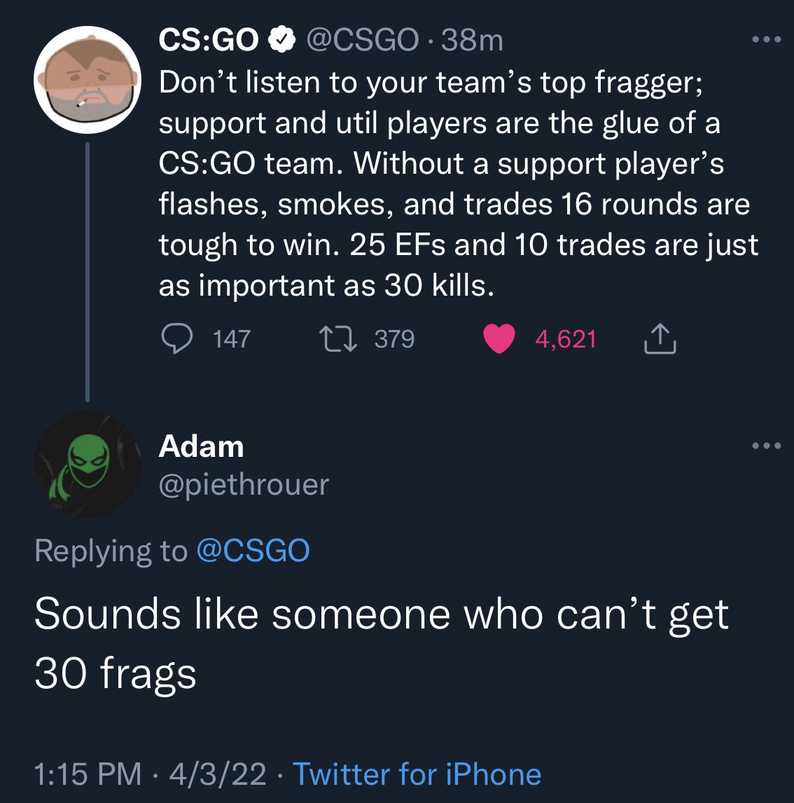 Don’t listen to your team’s top fragger; support and util players are the glue of a CS:GO team. Without a support player’s flashes, smokes, and trades 16 rounds are tough to win. 25 EFs and 10 trades are just as important as 30 kills.