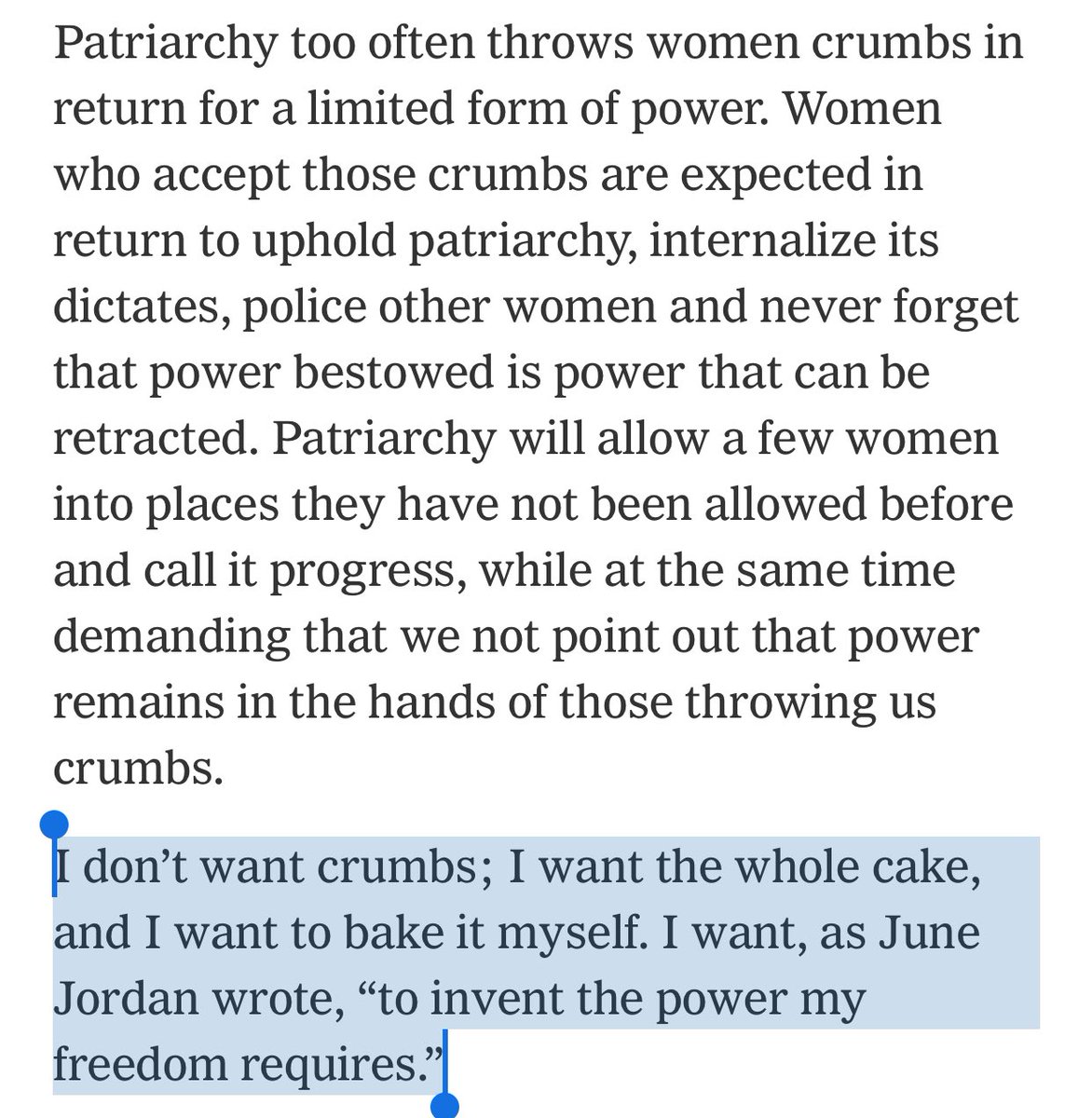 Patriarchy too often throws women crumbs in return for a limited form of power. Women who accept those crumbs are expected in return to uphold patriarchy, internalize its dictates, police other women and never forget that power bestowed is power that can be retracted.pic.twitter.com/Fs7xAjDsFH