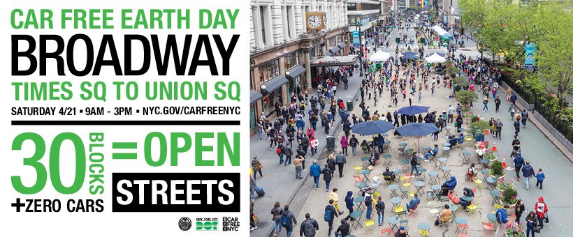 @NYC_DOT on Saturday, April 21 to celebrate#CarFree#EarthDay, which will open 30 blocks of Broadway from@TimesSquareNYC to@UnionSquareNY. Info: https://on.nyc.gov/2Ivx39T pic.twitter.com/gZXmy86kVZ