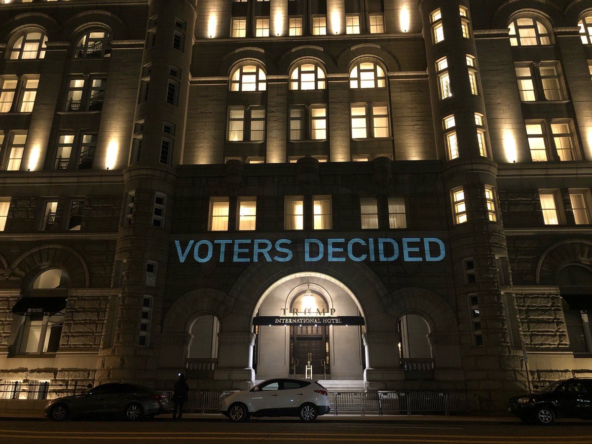 A source shared these photos. Democratic protestors are projecting a message onto the Trump Hotel in DC tonight, where Shirkey and Chatfield are thought to be staying: “The World is Watching. Voters Decided.”pic.twitter.com/g0KHjjKCUy
