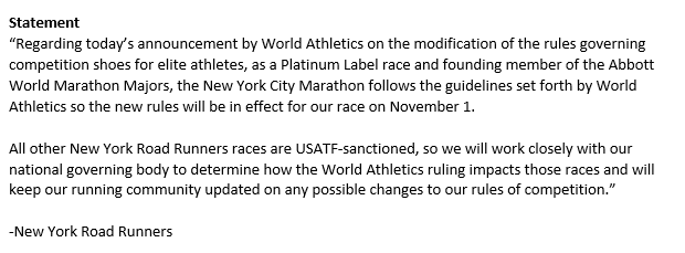 @nyrr@nycmarathon statement on the@worldathletics ruling about governing competitive shoes for elite athletes.pic.twitter.com/6SSALSEAvu