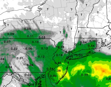 Our area of "concern" for higher snowfall totals is over South/Central NJ. This area is aligned just N of mid level lows, near best lift.