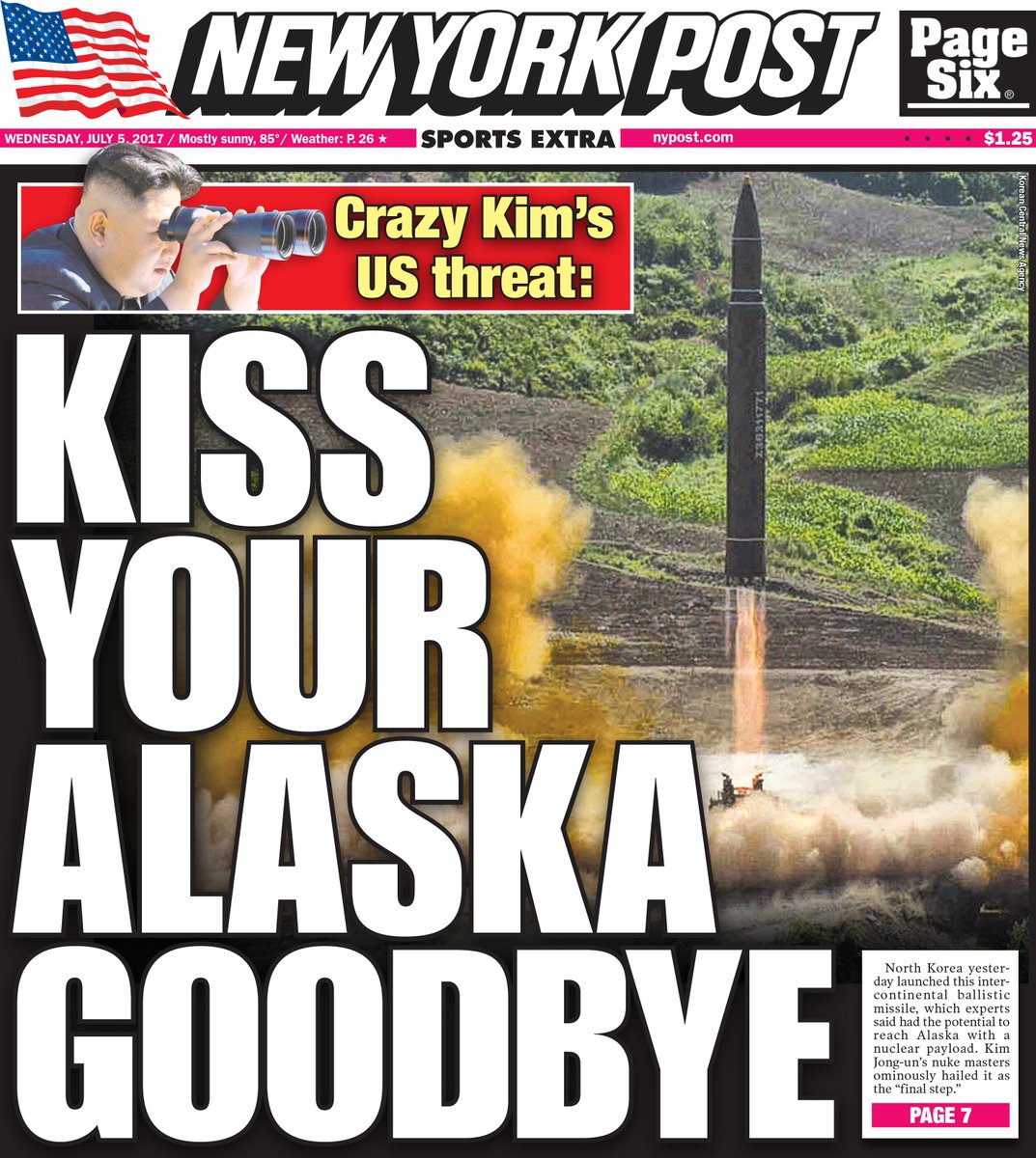 Wednesday's Cover: Kim Jong Un says his ICBM missile launch was a Fourth of July 'gift' to 'American bastards' http://nyp.st/2unIwCg pic.twitter.com/BzqdDDUYz4
