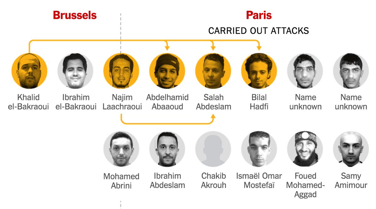 At least two of the men involved in the Paris and Brussels attacks had roles in both plots. http://bit.ly/attackers pic.twitter.com/H3UYoIxOpN