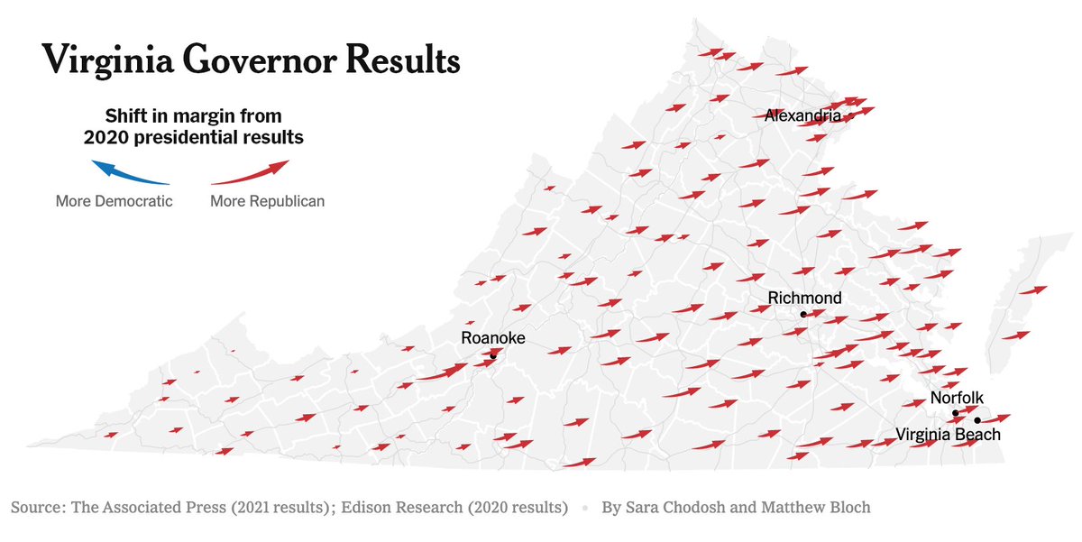 In the Virginia governor's race, Glenn Youngkin, the Republican, received stronger support in every corner of the state than President Trump did in 2020. https://www.nytimes.com/2021/11/03/us/politics/democrats-virginia-governor-race.html …pic.twitter.com/fpGYv9dkfb