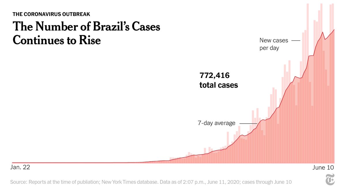 As of this week, more than 30,000 people have died from the coronavirus in Brazil, including 1,262 on Tuesday — which was the nation’s highest one-day total. The country is nearing 800,000 cases, second only to the U.S. http://nyti.ms/2YoAyIU pic.twitter.com/y6vC1PTuUh