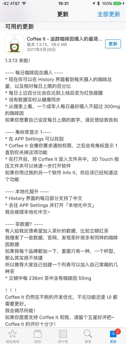 「Coffee It」1.3.13已经上架嘿嘿 主要对 History 界面增加了每日总摄入,相对的上限百分比,中文优化,and一样的,像 Info It 一样支持了角标显示 1 [doge][doge][doge]pic.twitter.com/uIo56IrMRP