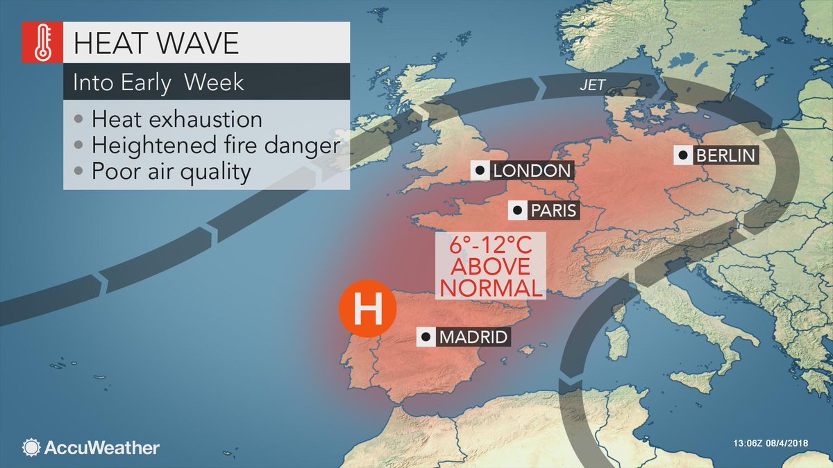 On Saturday, the temperature hit 113F (45C) in Cordoba, Spain and 111F (44C) in Lisbon, Portugal. The high temperature in Madrid has exceeded 100F (38C) each day so far this month, a trend that will continue through Tuesday: https://goo.gl/T2crGZ pic.twitter.com/Me9gQa9fN1