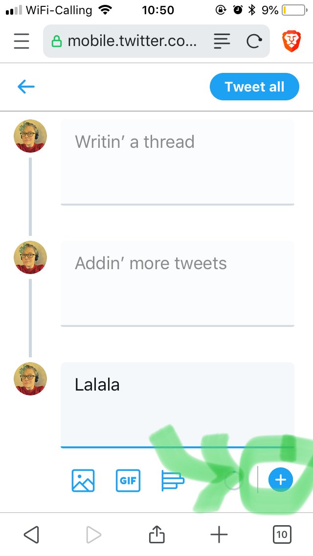 Sorry, that wasn’t clear at all! I mean, posting a thread all at once with the “add another tweet” button, which is available on the web interface. Please excuse the daft screenshot.