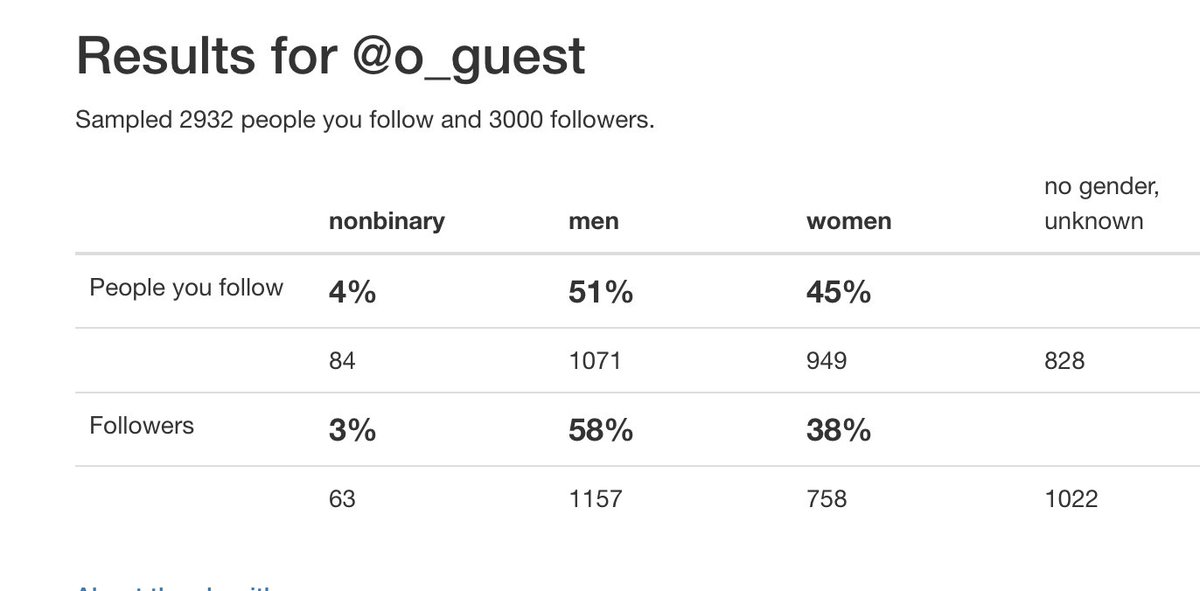 I recommend doing this: https://www.proporti.onl/ . It was unsettling to discover that I follow 60% men, and 60% of my followers are men. Binomial test p < 0.0001. I am going to follow women until this is fixed!https://twitter.com/M_Kosilo/status/1070001543552876545 …