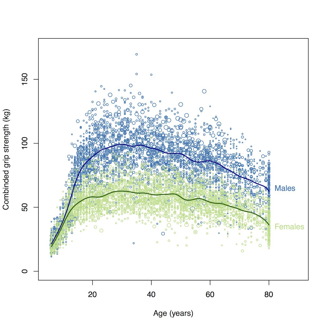 Combined grip strength in men vs. women, broken down by age. #dataviz