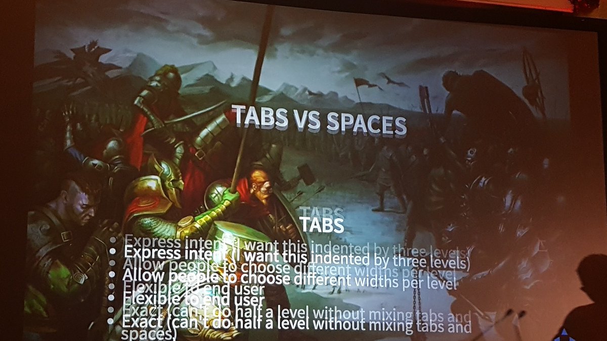 Tabs vs spaces @Singletoned #PyConUKpic.twitter.com/V4EmuCTo7j