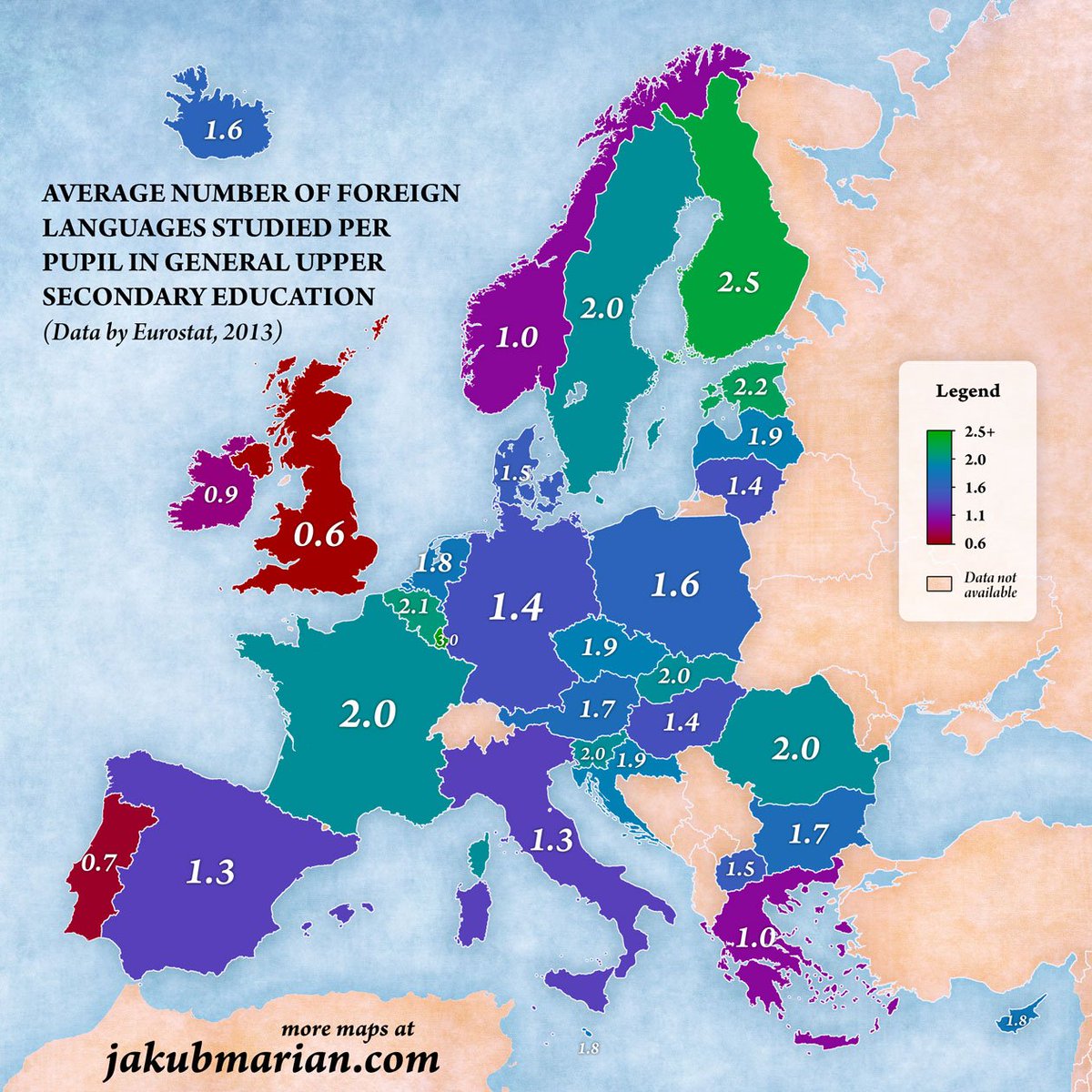 Average number of foreign languages studied per pupil in general... http://dlvr.it/MqffK2  #maps pic.twitter.com/XV5XytBnZT