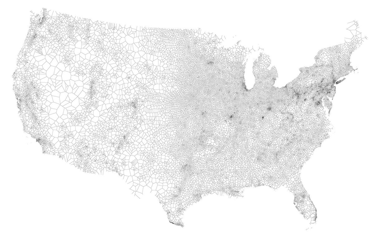 Voronoi of all of the cities and towns in the contiguous United States:pic.twitter.com/jrw56eqOfq