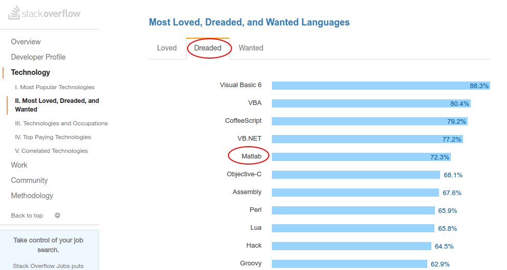 .@o_guest The @StackOverflow survey results made me think of you... (Matlab one of the most dreaded languages!) https://stackoverflow.com/insights/survey/2017/?utm_source=so-owned&utm_medium=blog&utm_campaign=dev-survey-2017&utm_content=blog-link …pic.twitter.com/LSW4ywrEjj
