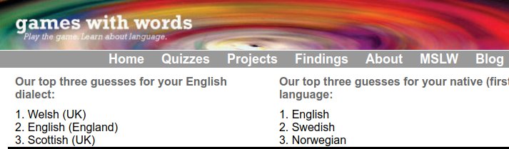 I think I took one of those tests and it wasn't very good at guessing when I'm from. Lemme see if I can find it.