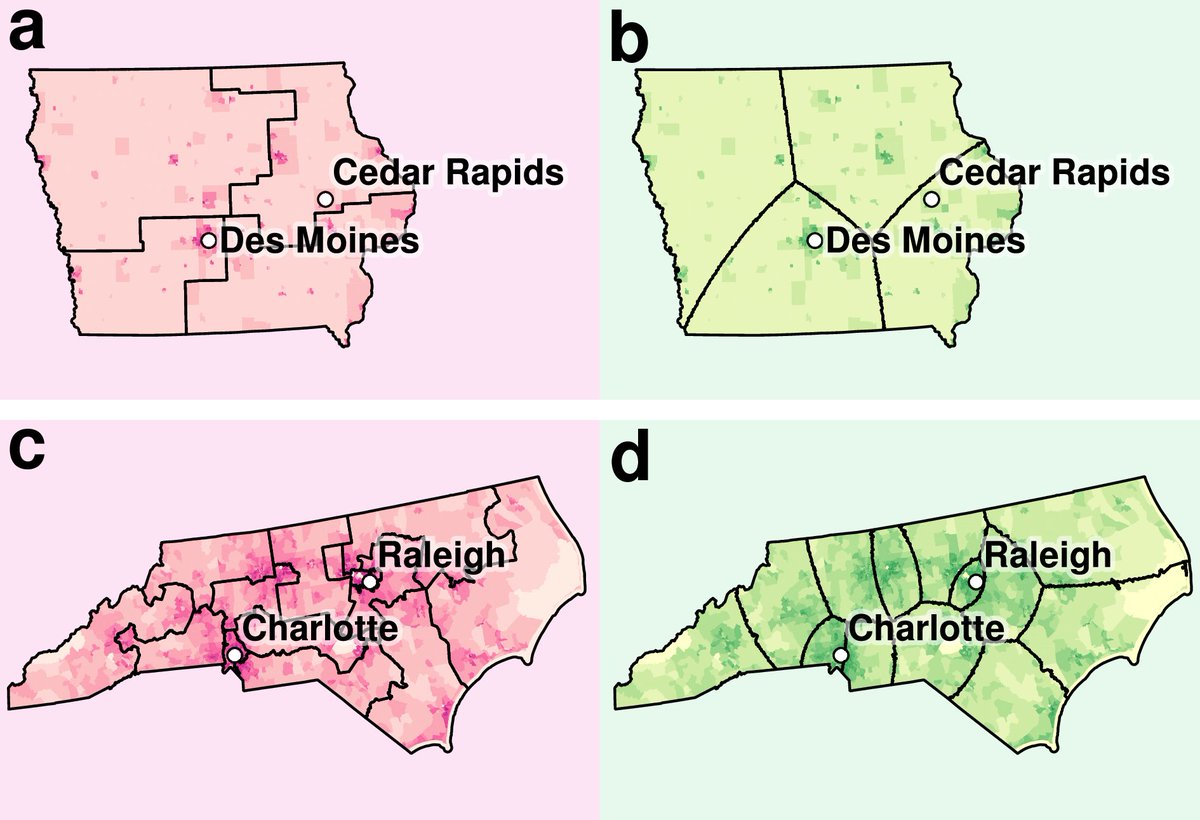 Take top row [taken from the preprint https://arxiv.org/abs/1711.04640 ], that's Iowa (a), our algorithm (b) improves on it, even tho they are trying their best. That's the thing! Even when it's done by impartial committees, computers still district better! More: http://redistrict.science pic.twitter.com/1oYxiAMbMK
