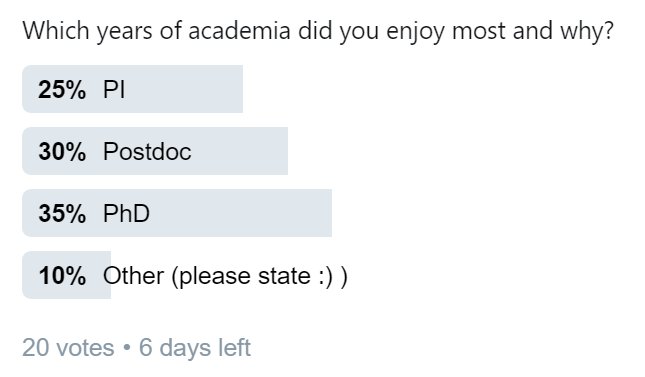 Ahh this makes me think! It seems some prefer PI, some postdoc years and some maybe some other time in academia still. Would love to hear from people Which years of academia did you enjoy most and why?