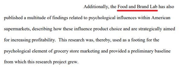 Just in case it wasn't clear, the work of Wansink and his lab is (or was?) seen as fundamental in his field. Source: Supermarket savvy: An analysis of psychological exploitation within grocery stores (http://digitalcollections.sit.edu/cgi/viewcontent.cgi?article=3623&context=isp_collection …)pic.twitter.com/i63bmGC5Wj