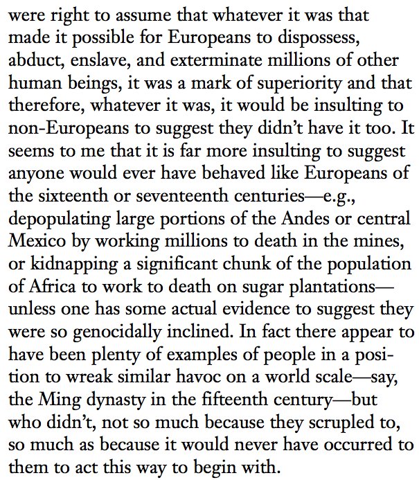 "it is far more insulting to suggest anyone would[ have ever behaved like Europeans of the [16th] or [17th] centuries—e.g., depopulating large portions of the Andes or central Mexico by working millions to death in the mines" —@davidgraeber, Fragments of an Anarchist Anthropologypic.twitter.com/g0rIWqtkL9