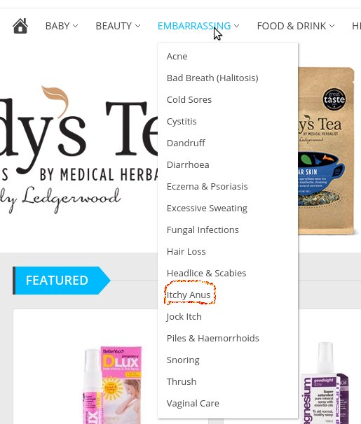 So like I am trying re-order some probiotics and... I notice the menu item "Embarrassing"... MY DUDES. Somebody needs to explain to you how this is worse than the actual items on the sub-menu. Also I'm a child so: "Itchy Anus". LOL