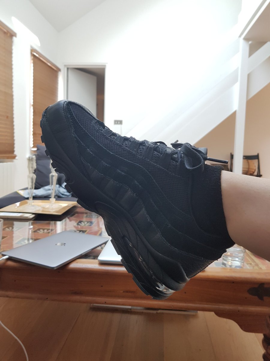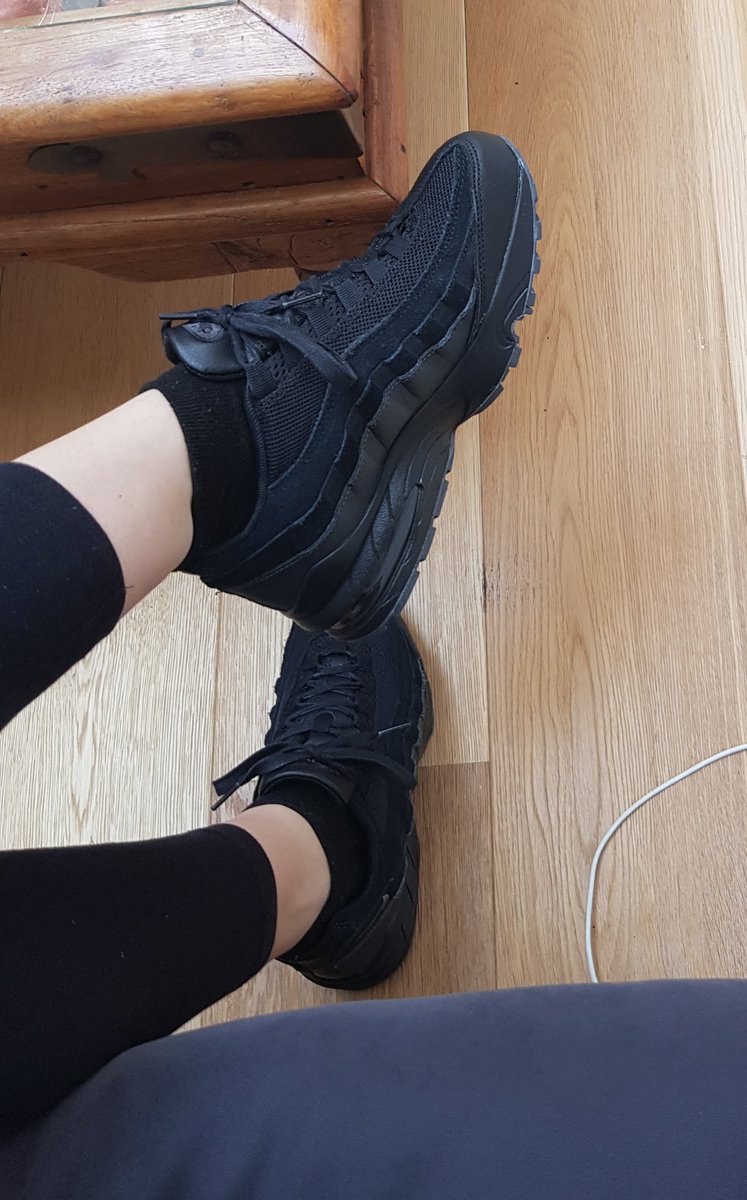 I never wear shoes around the house but I've not worn these outside and my arches need extra support so WTV. Black leather Air Max 95s. Peak #HealthGoth. 🖤💪 INB4: Where's the toe bubble? Yes, yes, I'm wearing children's cos I'm a 5. 🤣pic.twitter.com/la09wR1Af4
