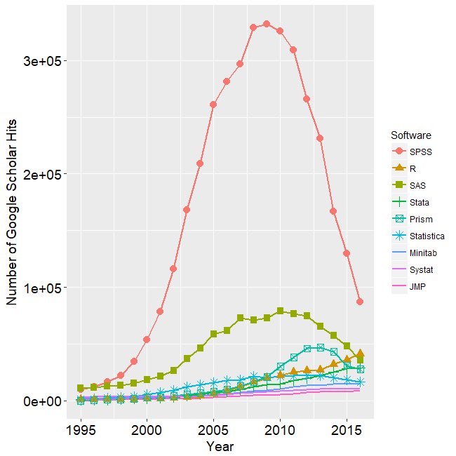 If you’re STILL hesitant to make the switch, from SPSS to #Rstats just check out these usage trends for statistical software http://r4stats.com/articles/popularity/ … Your department might be the last one teaching SPSS, but that doesn’t mean you have to be the last person using itpic.twitter.com/QxjKTPLDQg