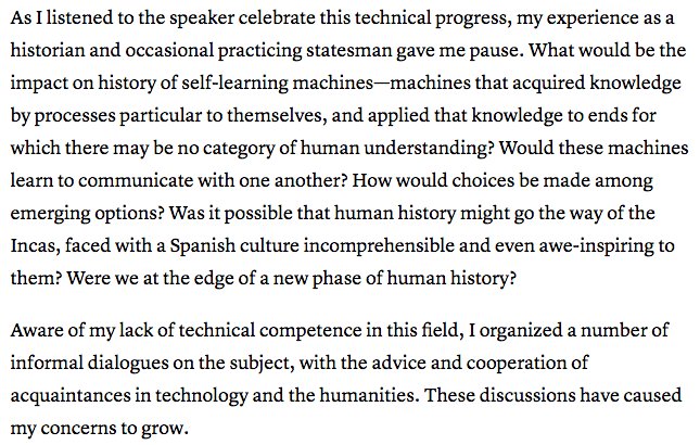 I think Henry Kissinger just found out about AI and this essay is just adorable https://www.theatlantic.com/magazine/archive/2018/06/henry-kissinger-ai-could-mean-the-end-of-human-history/559124/ …pic.twitter.com/czRuuT74gt