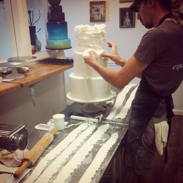 Tims's venturing beyond his sculpted cake comfort zone today and tackling this pretty wedding cake. Such ruffles!pic.twitter.com/06VhRPPFWZ