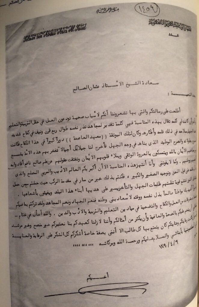 جواب الملك سلمان حفظه الله على رسالة الأستاذ عثمان الصالح رحمه الله التي ودع فيها العمل في حقل التربية والتعليم