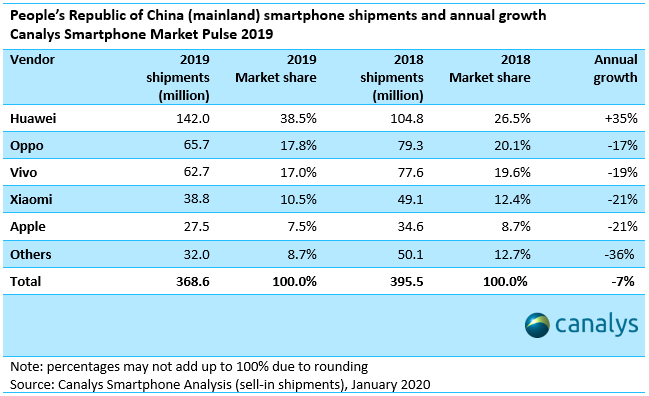 The good news for Apple is that smartphone sales in China ONLY fell 21% in 2019. Huawei up 35%.pic.twitter.com/QGy5GB2BUo