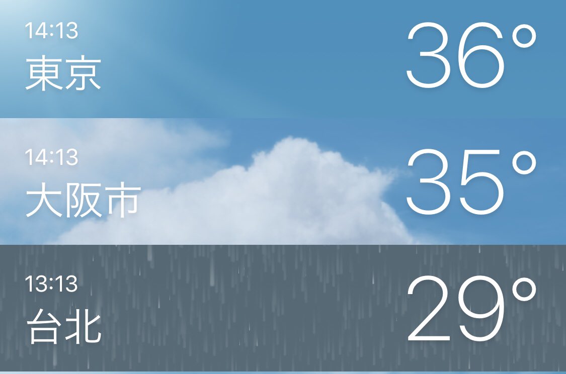 暑い。暑すぎる。 毎年この時期は台湾へ”避暑”に行っていたけど、今年は行けない… 台湾のほうがそもそもの気温が低いし、お店に入っても冷房の効きが良い。日本はどこ行っても弱冷房。 こんなのもう嫌だ!旅行したーい!pic.twitter.com/1VW17rVCql