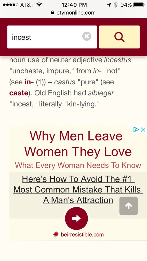 Insidious incel propaganda ad, when searching for the word 'incest' on an etymology website.pic.twitter.com/fSZousvGqS