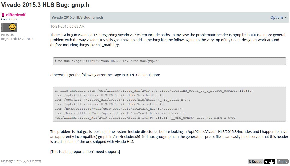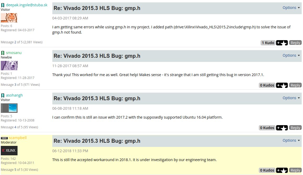 Three years. The @XilinxInc engineering team is "investigating" on how to fix a trivial bug in HLS co-simulation related to the order of include directories for three years now. This is just surreal.pic.twitter.com/F7JU89tcwe
