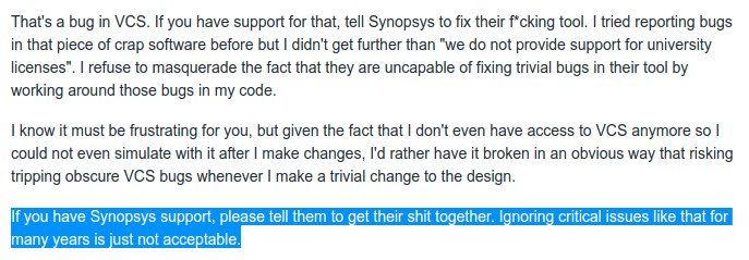 CC everyone with a support contract for @synopsys VCS. Please ask them to fix their tool, don't ask me to work around VCS bugs. If you feel like asking all core devs to work around all VCS bugs is easier than getting Synopsys to fix their tool, maybe rethink using their tool.pic.twitter.com/fIEMXOGAr9