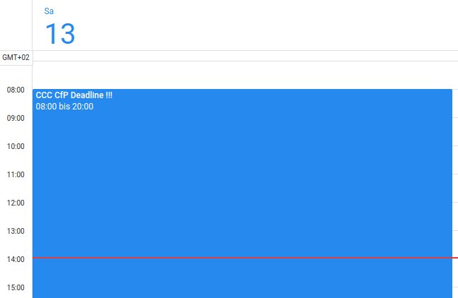 Current status: Non-subtle calendar entry is not subtle. !! PSA: Hard 35C3 CfP deadline is Monday !! As usual: No extensions! No excuses! So submit your proposal this weekend.pic.twitter.com/nmNQwPbYi8