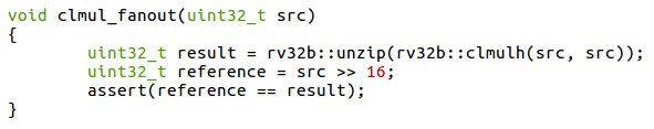 Thanks! I've now added that as clmul(h) use-case (and "zip" use-case, which is the more obvious choice for morton-codes within xbitmanip) to the current draft document at https://raw.githubusercontent.com/cliffordwolf/xbitmanip/master/xbitmanip-draft.pdf …, and added you as contributor, and added the following invariant to my tests.pic.twitter.com/32dWnYWLTh