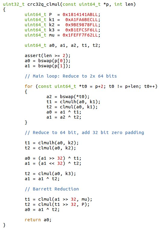 The code above is for CRC32Q. Here is the code for the zlib/pkzip flavor of CRC32, with all-ones init state, input and output reflection, and output inversion. (zlib/pkzip CRC32 is the worst flavor imo. I think this makes it a great example. :)pic.twitter.com/EC5ivSbYsi