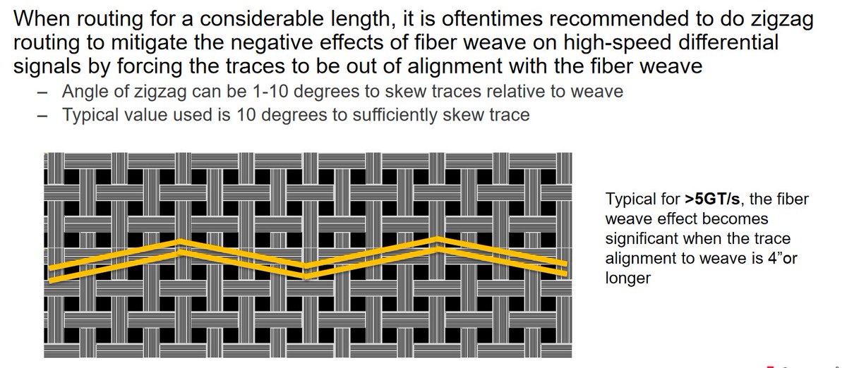 TIL about the fiber weave effect. PCBs are made from fiberglass, which has a weave. As such, if you route a pair of high speed signals in a straight line, one trace might be over a different density of weave, which changes the dielectric constant of the substrate under it.pic.twitter.com/h5X9CjHdtV