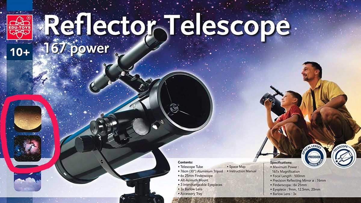 I think we can all agree that this 70 EUR telescope did not take those pictures of Mimas (?) and M20. I wish there were severe criminal consequences for this kind of advertisement.pic.twitter.com/60rnZnhsl3