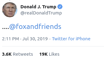 3.6K retweets of nothing but "....@foxandfriends"!? I guess we now have a baseline figure for the number of Russian bots retweeting literally anything the useful idiot posts.pic.twitter.com/S6bWSo4Tf5