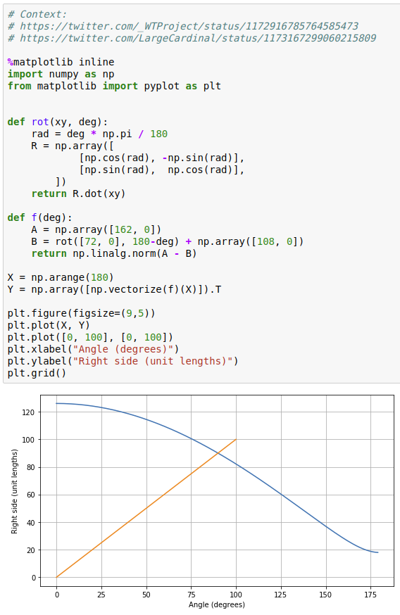 Nice puzzle but the use of unitless "x" for "x unit lengths" and for "x degrees" (not radians) is causing me nervous eyelid spasms. Technically it's not wrong I guess (bc degrees aren't a proper unit) but it's definitely not right either.https://twitter.com/_WTProject/status/1172916785764585473 …