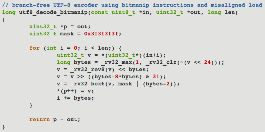 This is just a benchmark example to see if the hot loop can be written branch-free using RISC-V BitManip instructions. Edge cases can be handled in branches that are __builtin_expected() to be not taken.