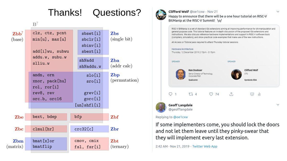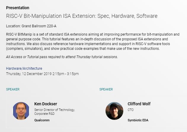 Happy to announce that there will be a one hour tutorial on RISC-V BitManip at the RISC-V Summit! \o/pic.twitter.com/qIAjFpTw3Y