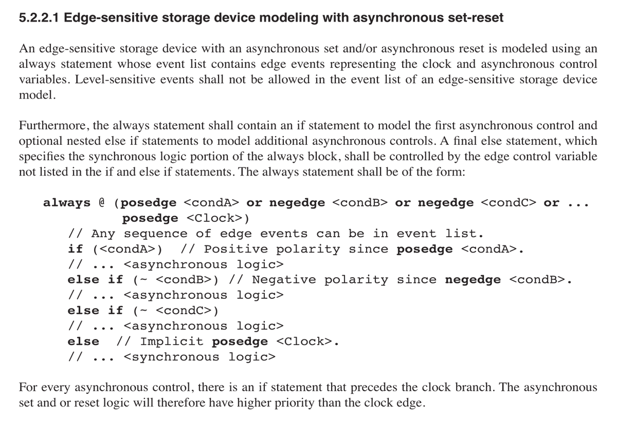 currently enjoying how IEEE 1364.1 instructs you to use a specific style to describe a flip-flop with multiple prioritized asynchronous resets, but if you actually follow it and have more than one reset (e.g. Xilinx FDCPE) you'll always get a sim/synth mismatchpic.twitter.com/nZJHm6HFXy