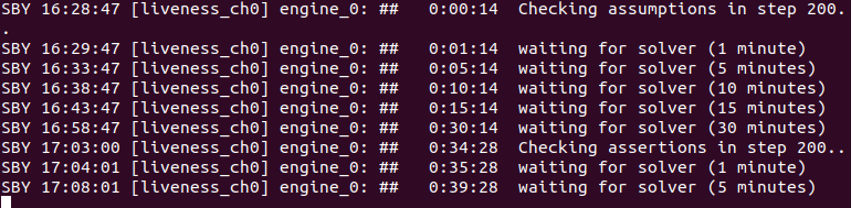 Keep extending the BMC depth, and the solver finds new combinations of multiplies, bus stalls and branch mispredicts that make my processor stall for that long. Currently at 100 cycle check bound (with trigger at cycle 25), max bus stall 20 cycles