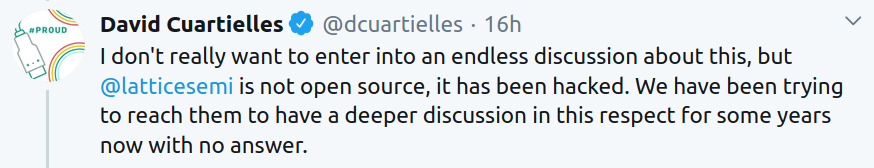 So, while the ICE approach has been making a tool that works on certain hardware that had to be hacked, our hack was to make a toolchain that runs on anything programmed in C. And then we can go on an endless rant about how open is open or that is more open.