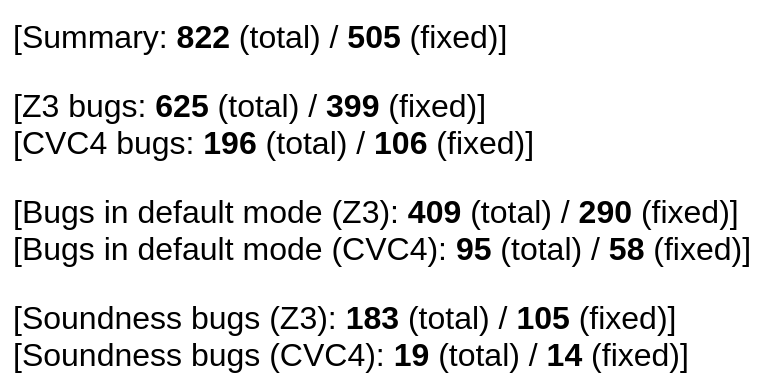 Very happy to feature the work of @DominikWinterer, @chengyuzh and @zhendongsu on testing SMT solvers. They found 800+ bugs (500+ fixed) in Z3 and CVC4, two state-of-the-art SMT solvers, 250+ were critical soundness and invalid model bugs. Check out http://testsmt.github.io pic.twitter.com/JqChGLRAjB